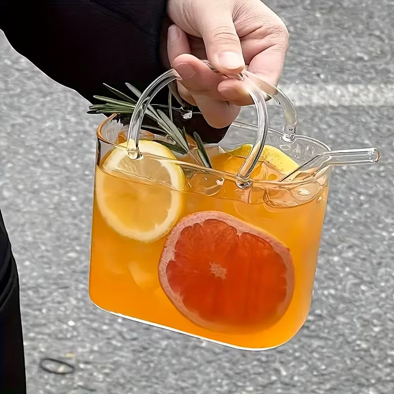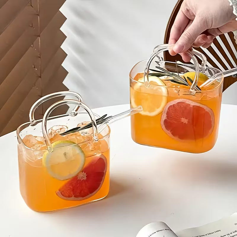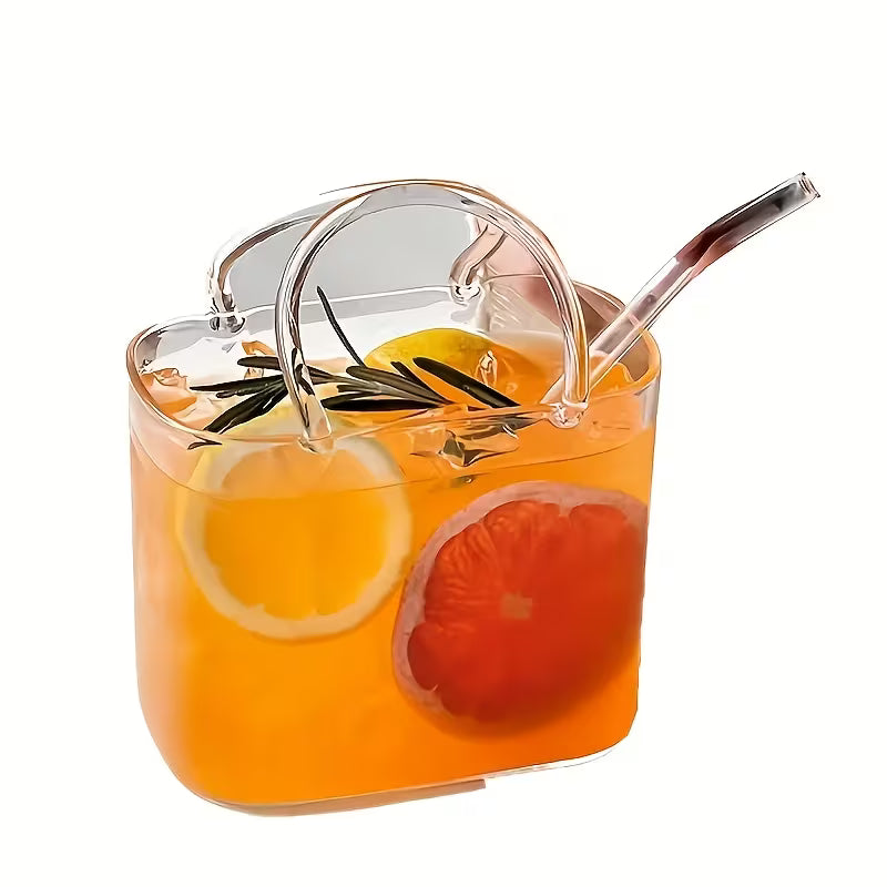 كوب زجاجي محمول مصمم على شكل حقيبة يد. بتصميمه المرح واللافت للنظر، فهو مثالي لتقديم الكوكتيلات والعصائر والمشروبات الباردة.