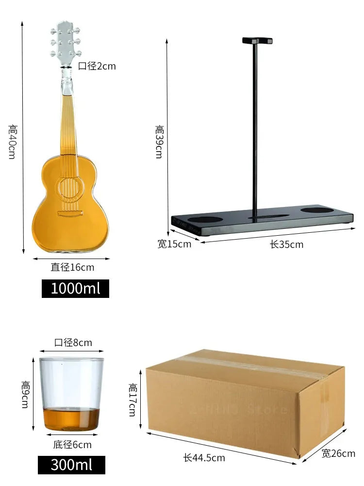 Gitar formundaki şişe, yalnızca bir içki kabı değil; aynı zamanda bulunduğu ortamda dikkat çeken dekoratif bir obje niteliğindedir. Özel metal standı sayesinde şişe ve bardaklar düzenli, dengeli ve estetik şekilde sergilenir.