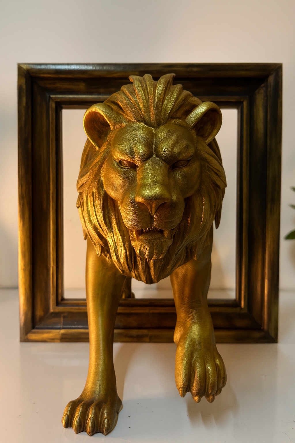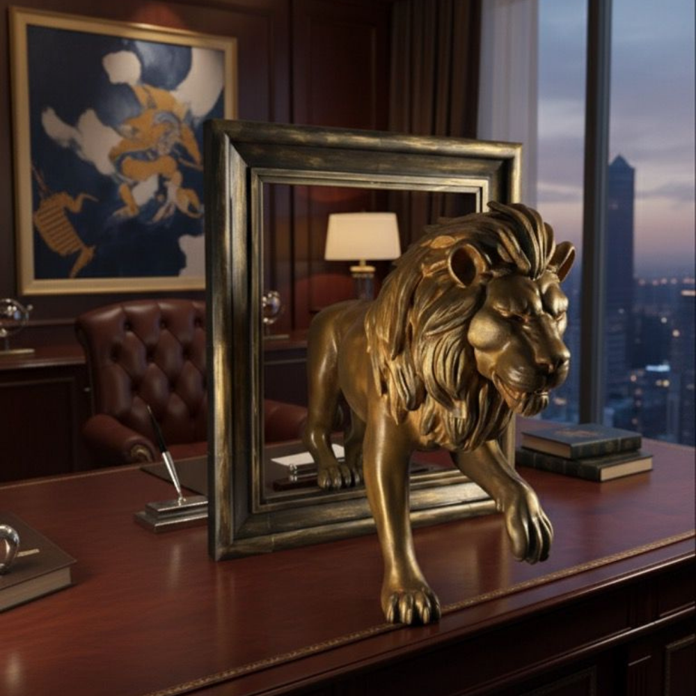 Çerçeveli Altın Aslan Heykeli, modern ofisler, oturma odaları veya giriş alanları için etkileyici bir odak noktası yaratır.