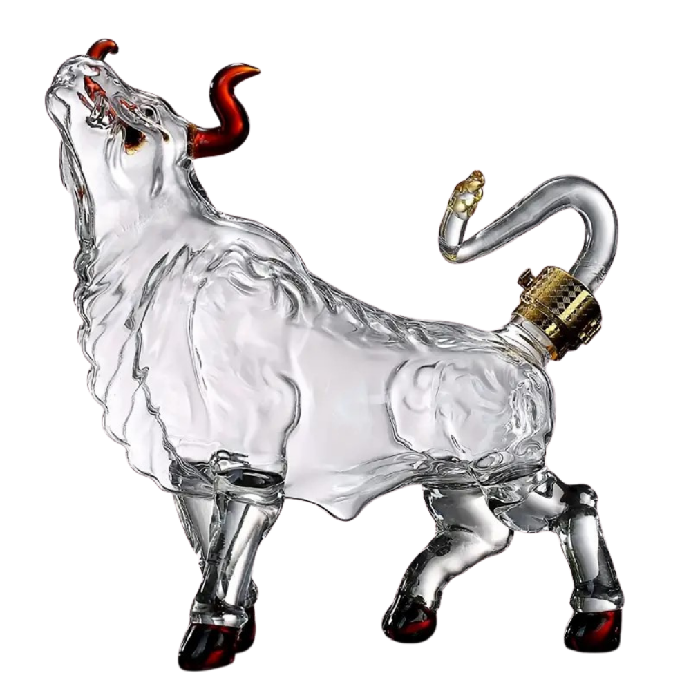 Güç, bereket ve zarafeti simgeleyen bu boğa figürlü cam dekantör, el işçiliğiyle üretilmiş şık bir tasarıma sahiptir. 1000 ml kapasitesi sayesinde viski, şarap, likör veya özel içecekler için mükemmel bir sunum sağlar.