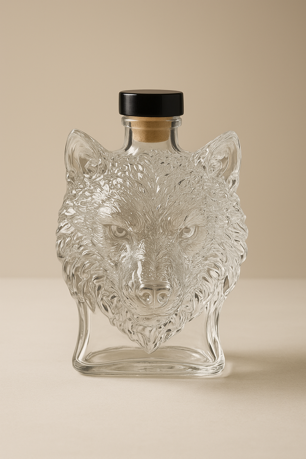 Bu 300 ml kapasiteli cam şişe, kurt siluetiyle işlenmiş detaylı bir tasarıma sahiptir. Kaliteli cam malzemesi ve şeffaf yüzeyiyle ışığı zarif biçimde yansıtır; masa, konsol veya vitrin üzerinde dikkat çekici bir dekoratif obje oluşturur.